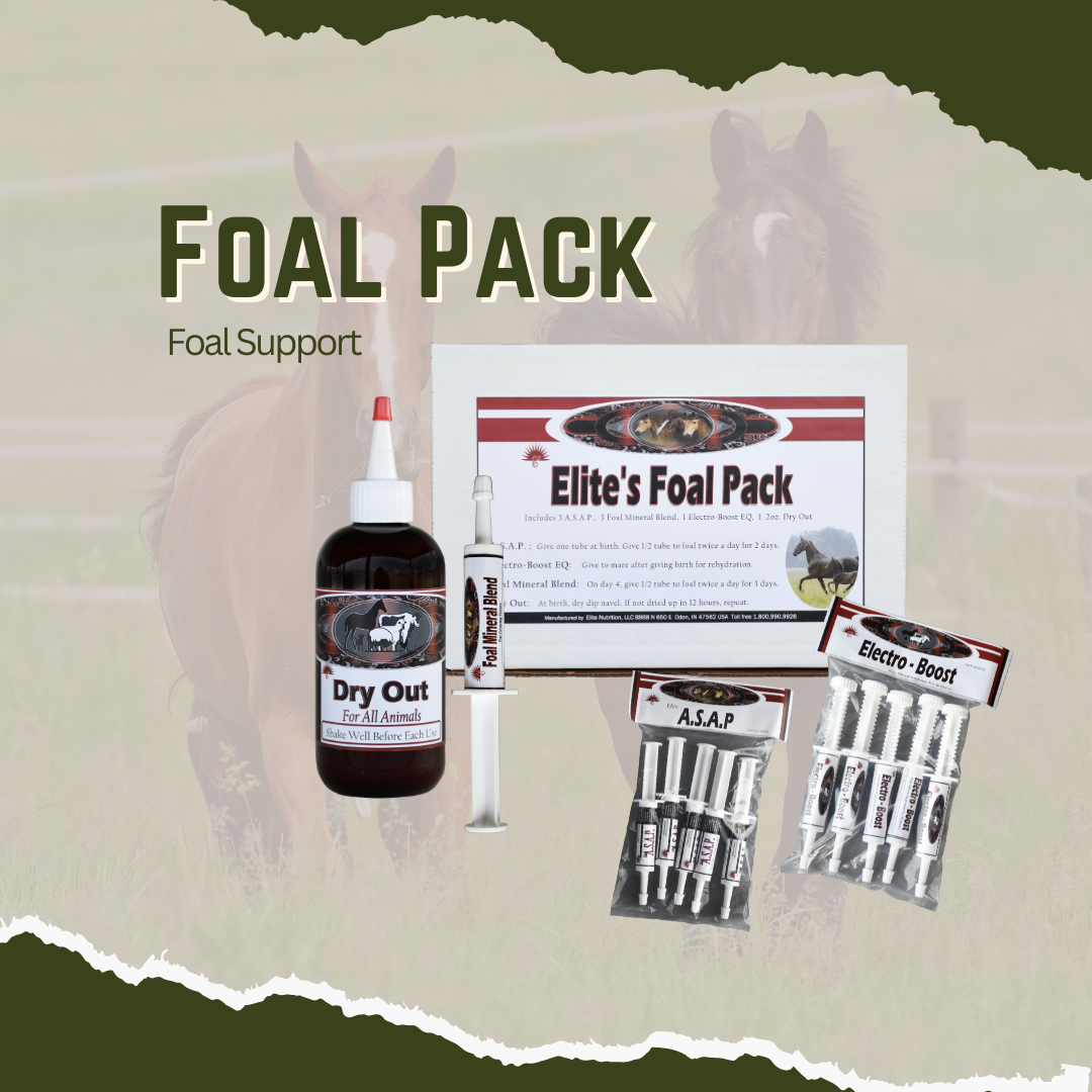 Keep your foal thriving with our Equine Foal Pack! This all-inclusive pack includes four essential products - "Dry Out", "Foal Mineral blend" "ASAP" , and "Electro Boost" - all designed to keep your foal happy and healthy.