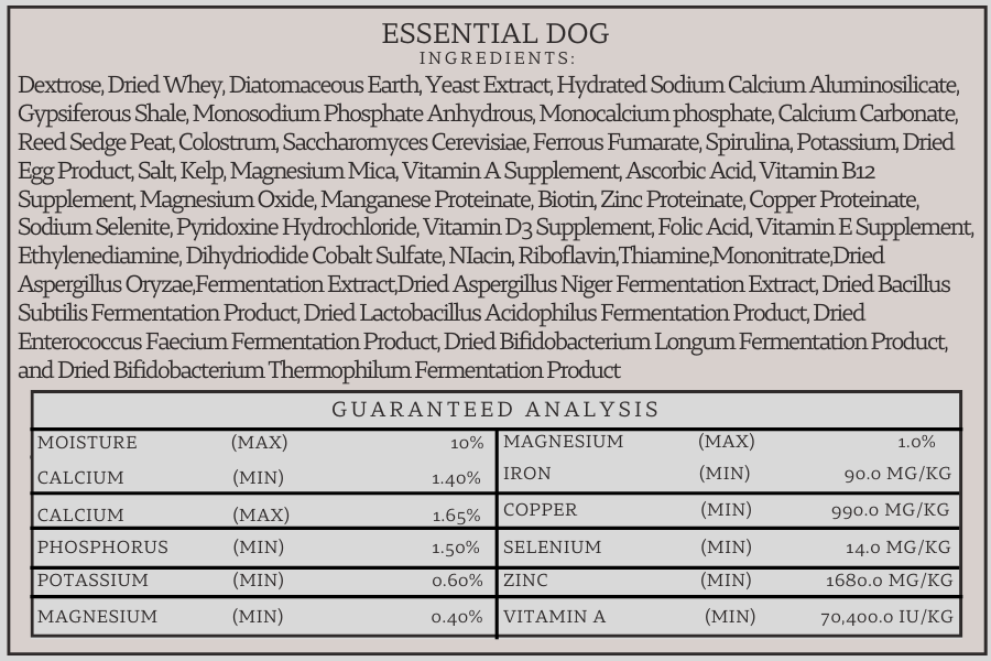 Essential Dog is formulated to provide an extra boost of nutrition, energy and immunity to dogs as they are growing, breeding or aging. Packed full of nutrients that target specific weaknesses or problems like intestinal issues, parasite issues, breeding issues, weak bones, skin and hair coat issues and ph disturbances. MOS Yeast helps prevent pathogens from binding to the intestinal lining. Also intensifies resistance to numerous other bacteria, viruses, molds and fungi. Naturally mined and chelated minerals are highly absorbable. Kelp and Spirulina are also great sources of natural vitamins and trace minerals.